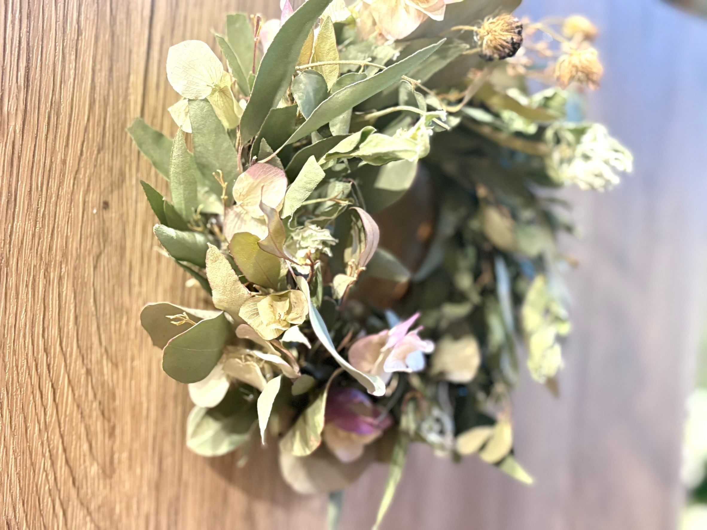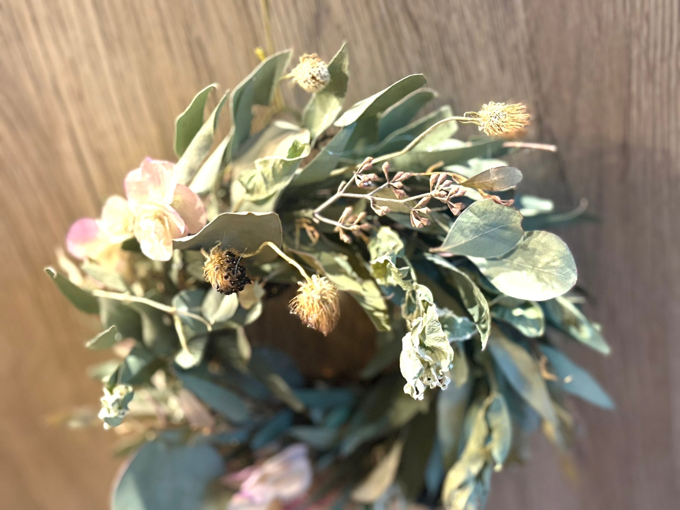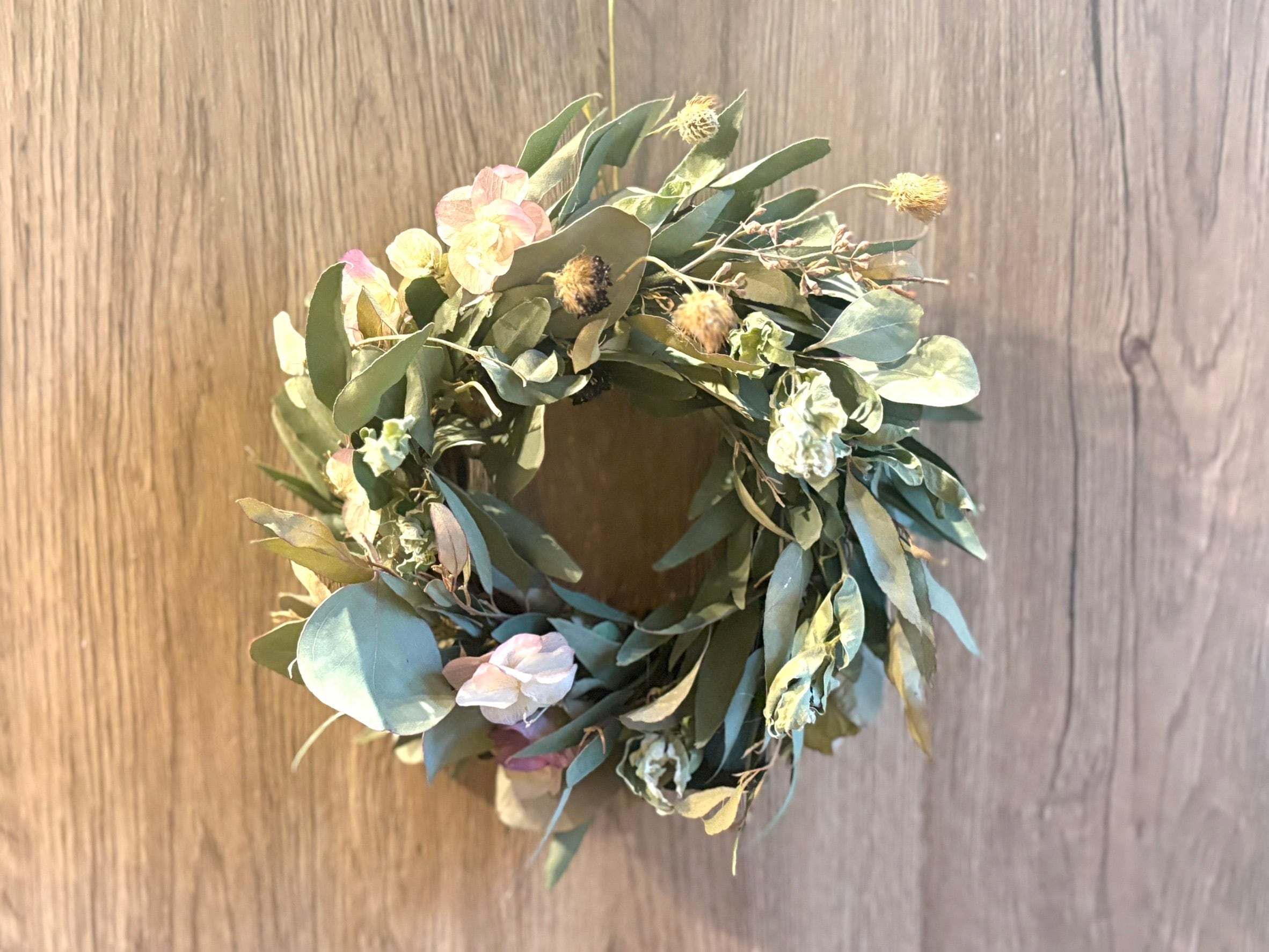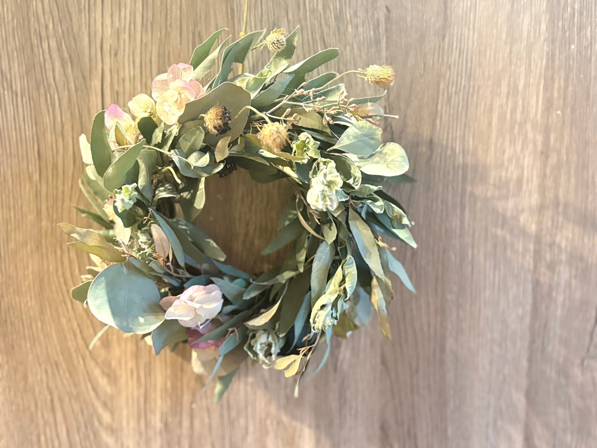 お花とグリーンが入ったかわいいドライフラワーリースです⭐︎